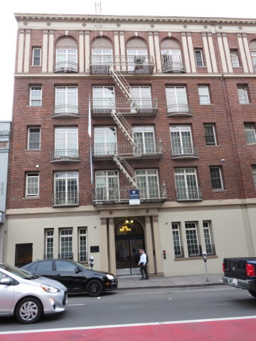 This view of the apartment building at 735 Geary shows its balconies, its top-floor pilasters, and its many arches - as well as its similarity to its neighbor, the Earl Court Apartments.