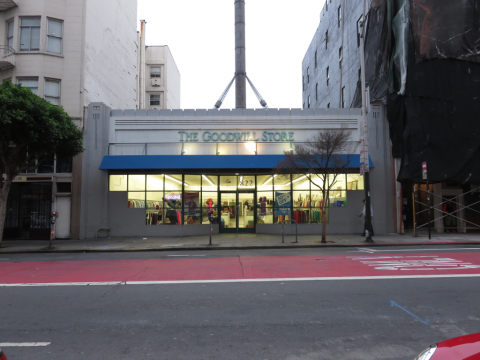 The Geary Street facade of this streamlined Moderne one-story retail building shows its fluted end piers, crenellated parapet, and streamlined cornice.