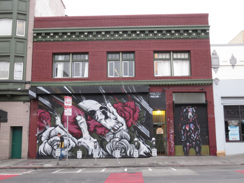 The Geary facade of this simple brick building shows its lovely brickwork and handsome galvanized iron cornice.