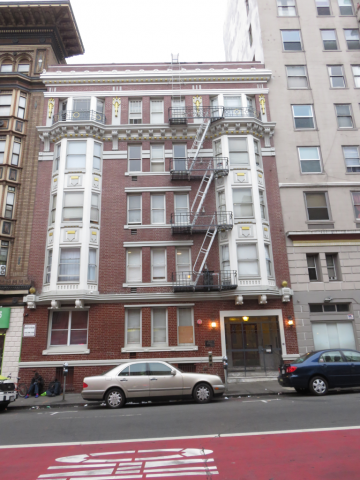 Copyright 2015, Kristi Wachter. Some Rights Reserved.Creative CommonsImage Credit: The Geary Arms Apartments is a brick building with a 3-part vertical composition, featuring multi-story bay windows, spandrel panels, and a cornice. Geary Arms ApartmentsSites: San Francisco