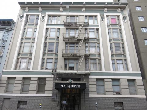 Copyright 2015, Kristi Wachter. Some Rights Reserved.Creative CommonsImage Credit: The facade of the Marquette Apartments shows the awning and cartouche over the entry, and its 2-part vertical composition. Marquette ApartmentsSites: San Francisco