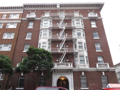 Copyright 2015, Kristi Wachter. Some Rights Reserved.Creative CommonsImage Credit: The facade of the St. Anthony Apartments shows the brickwork, the multi-story bay windows, and the projecting cornice. St. Anthony ApartmentsSites: San Francisco