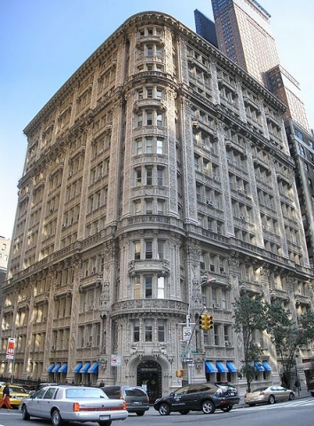 This corner view of the Alwyn Court apartment building shows the rounded corner, the projecting horizontal ornamental bands, and the effusive French Renaissance ornamentation all over the terra cotta facade.