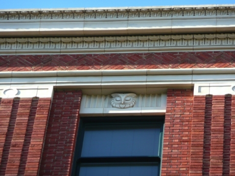 The brickwork on the top floor creates fluted pilasters and zigzag patterns below the cornice. You can see an owl, the club's mascot, above the window.