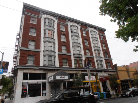 This photo of the west facade of the Gates Hotel Apartment building shows the brickwork and the bay windows.