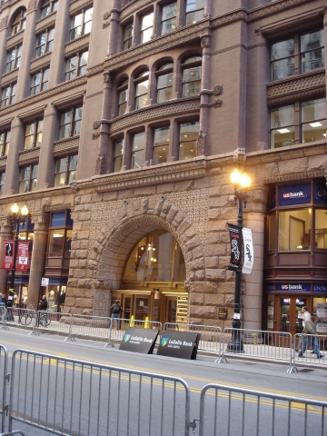 This photo of the front of the Rookery Building shows the entry arch, the arched windows, and the Moorish decoration on the facade.