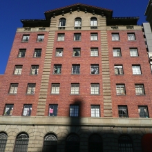 A women's hotel called the Residence (1929-30) on Nob Hill in San Francisco was Morgan's last major building for the YWCA. Its formal exterior of brick with tile decoration is well suited to the Powell Street site; the building turns the corner to adjoin the Chinese YWCA, also designed by Morgan. Tall arched windows along the front illuminate formal public rooms, a paneled library with a fireplace imported from France, and a large assembly room. Originally located along the axis to the large formal living room (40 by 60 feet) were a central dining room and kitchen on one side and smaller dining and sitting rooms on the other. The living room's tall windows look out on Chinatown, and its long interior wall, which Morgan had decorated with a silk wall covering, now has a Chinese mural.
