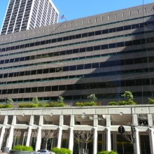 The main building is clad in granite. The structure is stepped, retreating as the building rises.