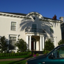The unusual curved pediment highlights the facade of this understated and elegant home. Bliss and Faville's Beaux Art training is apparent in the Ionic columns supporting the portico.