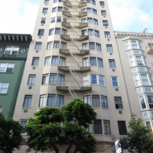 The Beverly Apartments starts with a 2-part vertical composition and adds Gothic ornamentation, including a pointed arch entry. Its bay windows extend 11 stories.