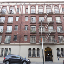 The imposing Earl Court Apartments has a 3-part vertical composition with a stucco base and brick-clad upper stories. The facade features iron balconies, pilasters on the top floor, and a block modillion cornice.