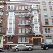 The Geary Arms Apartments is a 3-part vertical composition. The brick building has 4-story bay windows, spandrel panels, and a cornice.