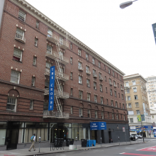 This elegant brick apartment building is a three-part composition with block modillions, iron balconies, and tasteful terra cotta ornamentation.
