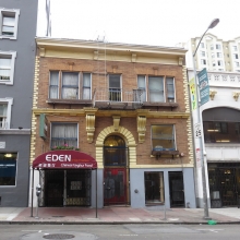 This delightful small hotel building has quoins, iron brackets, and a gorgeous arched entrance.