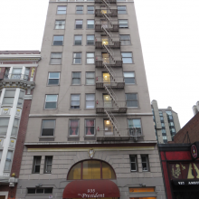 The Hotel Criterion - also known as the Hotel President - is a 3-part vertical composition with a rusticated base with an arched window over the entrance. The upper stories have a pilaster order, spandrel panels, and arches over the top-story windows.